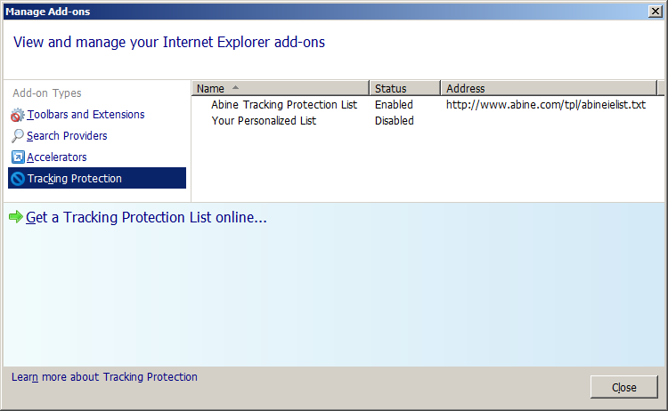 Note: The "Manage add-ons" buttons here is currently the only way you can configured "Tracking Protection" lists (see example below). However you first need to add the list to your browser Tracking Protection list before you press the "Manage add-on" button.