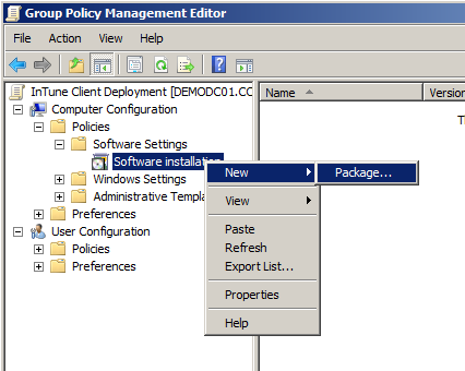 Step 5: Edit a Group Policy Object that is applied to all the workstation that you want to deploy the InTune client. Step 6: Navigate to "Computer Configuration > Policies > Software Settings > Software installation" then right click on "Software installation" then click on "New" then "Packages"