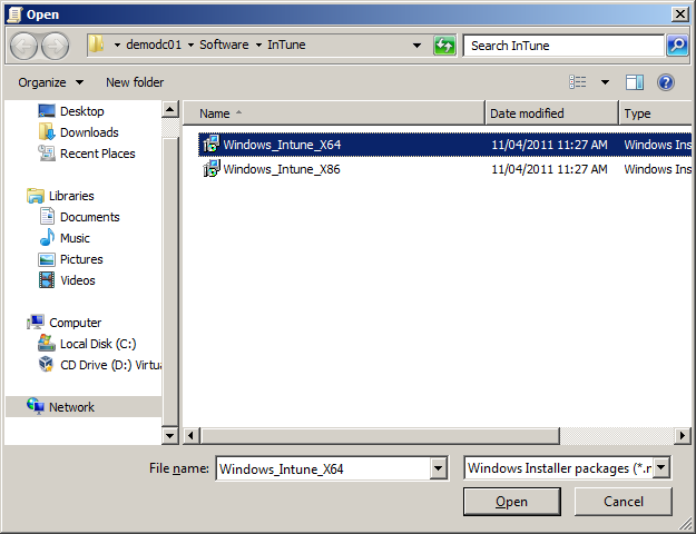 Step 7: Navigate to the path that you placed the installation files and select "Windows_Intune_X64.msi" then click "Open" Tip #3: If you have x86 client repeat from step 7 with the additional steps in my other article How to prevent x86 (32bit) applications installing via Group Policy on Windows x64 to prevent the x86 version from being deployed to the x64 platforms.