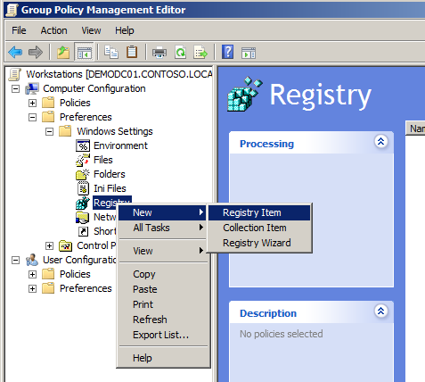 Step 2. Navigate to "Computer Configuration > Preferences > Windows Settings" then right click on "Registry" and click on "New > Registry Item"