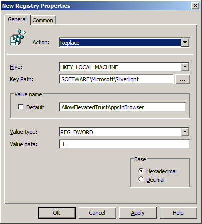 Step 3. Change the Action to "Replace" add the key path "SOFTWARE\Microsoft\Silverlight" type "AllowElevatedTrustAppsInBrowser" select the Value type to "REG_DWORD" and the value to "1".