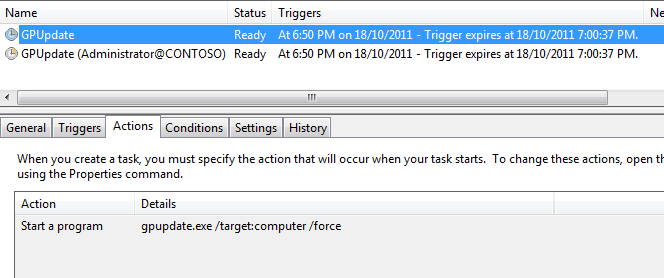 Seeing the task was scheduled I then took a look at the scheduled tasks on the computer being targeted and found that it had created two scheduled tasks to perform a gpupdate in the user and computer context.