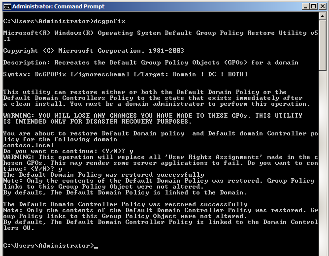 The command to restore the GPO's to default is as simple as running the "DCGPOFIX.exe" from a command line and press "Y" twice when prompted.