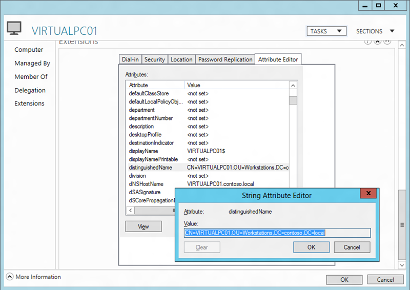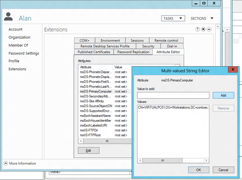 Step 3. Now navigate the user account you want to assign a "Primary Computer" and go to the "Extensions" option and then open the "Attribute Editor" select the "msDS-PrimaryComputer" and click "Edit" then paste the Distinguished Name of the computer you copied in step 2 into the "Value to add:" field and click "Add". Note: This allows multiple values so the users can be configured to have multiple "Primary Computers".