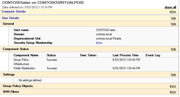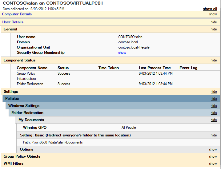 Note: If you are wondering why folder redirection is (or is not) being applied if this setting is enabled be aware that the Group Policy Results Report will NOT tell you why (or why not) that folder redirection is applied (see below). Primary Computer with Folder Redirection