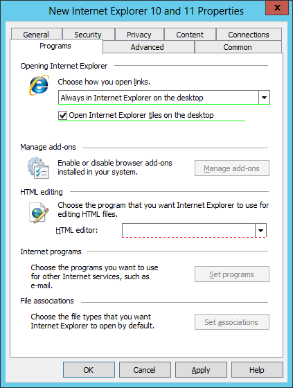 In Windows 8 there are now two different versions of Internet Explorer 10 installed. One is a Metro looking version that does not support Brower add-ons to improved performance and reliability of the touch version of the browser. The other more traditional desktop version of Internet Explorer allows browser add-ons (x86 only) but its controls are not as touch friendly (for more info see http://blogs.msdn.com/b/b8/archive/2011/09/14/metro-style-browsing-and-plug-in-free-html5.aspx). However if you are using Windows 8 on a traditional non-touch device however you will pretty much want to always want to default to the IE Desktop version as there is no advantage to running the Metro version without a touch screen. Along with the new browser there is of course new Internet Explorer 10 group policy preferences settings and one of these allows you to default the browser to always open in IE in desktop mode and below are the instructions you need to default the browser to Desktop Mode. Step 1. Edit a Group Policy targeted to a user and open "User Configuration > Preferences > Control Panel Settings" then right click on "Internet Settings" and then click on "New" and "Internet Explorer 10 and 11" Step 2. Click on the Programs tab and then choose "Always in Internet Explorer on the desktop" and tick "Open Internet Explorer tiles on the desktop"