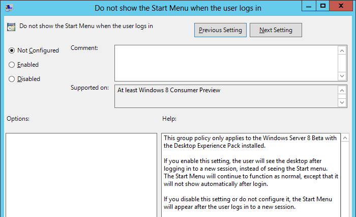 So unless you have been under a rock for the past 24 hours then you would have missed the public release of Windows 8 Consumer Preview and Windows Server 8 Beta. I have only been running less than 24 hours and I am finding heaps of new exciting Group Policy settings that I will blog about soon but one really stands out. The "Do not show the Start Menu when the user logs in" policy allows you to boot the OS into the more familiar desktop and not the Metro start menu. Interesting to note that booting into the desktop is also the default behaviour for Windows Server 8 so you can also use this setting on your server if you want to start them into Metro (but you prob don't want to). This setting can be found under User Configuration > Policies > Administrative Templates > Start Menu and Taskbar and of course only work on Windows 8 Consumer Preview.