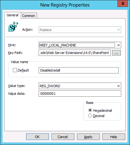 Step 2. To do this go to the common tab and tick the "Remove this item when it is no longer applied" option. This way the registry key will be deleted for any server that is approved to have SharePoint 2010. Then tick "Item-level targeting" and then click the "Targeting..." button. (Hence the Replace is used in step 1).