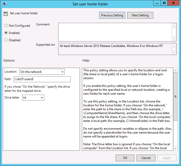 TIP: If you have your workstations segmented in your OU structure by site you may want to apply this policy setting at each site to the nearest file server you want to use for storing your home drives. This means that users will not have home drive re-map if they travel for a short time to other locations... Alternately you MIGHT want to apply this setting to your AD site however if you do this make sure you put a WMI filter on the policy so it does not apply to Windows Servers in the same site.. .