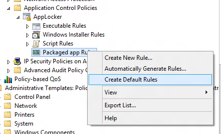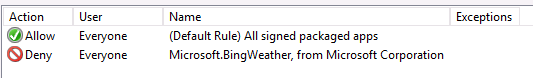 Warning: Whenever you try any thing in AppLocker the golden rule is to test everything first separate from production as there are many gotcha's when doing this... In this first example we are going to explicitly "Blacklist" the weather application. Step 1. As with Executable rules with AppLocker in Windows 7 the best thing to do first is to create the "Default Rules" so that you don't kill all access to your Packaged Apps.