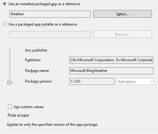 We then have to option to select a pre-install app or a packaged app (.appx) file to use as reference for the rule.