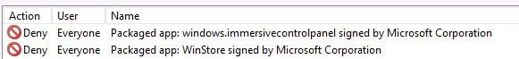 Now any additional Packaged that are not on this "White list" will be explicitly blocked from installing and / or running. Tip: You can block the "windows.immersivecontrolpanel" (a.k.a Metro Control Panel) and the "WinStore" (a.k.a. Windows App Store) if you want to prevent users from configuring windows using the Metro Control Panel or downloading any new apps from the store. ![]()