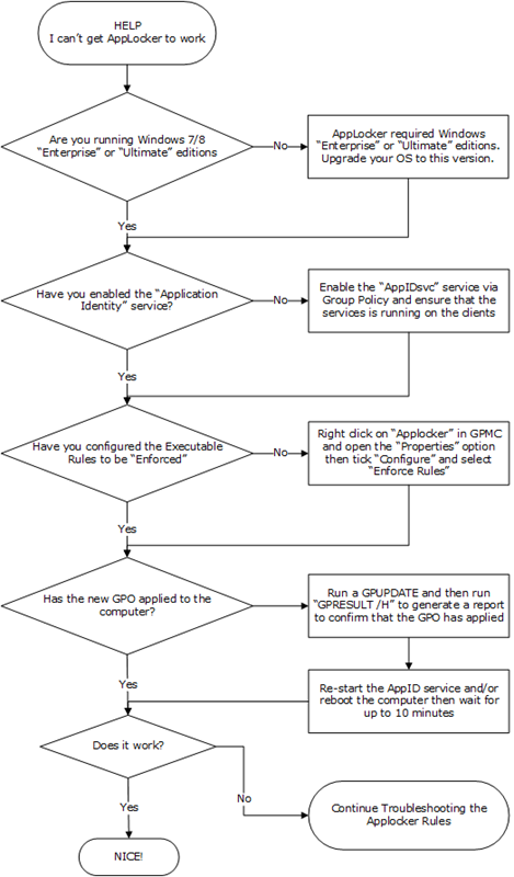 AppLocker is a great new feature that was introduced in Windows 7 that allowed IT Admins to prevent the running of certain application in their corporate environment (e.g. Chrome). However there are a number of steps and pre-requisites for this feature to work that seem to catch people up quite often. So below is a simple troubleshooting flow chart that should help you go through the common issues that happen when setting up an AppLocker rule in your environment.