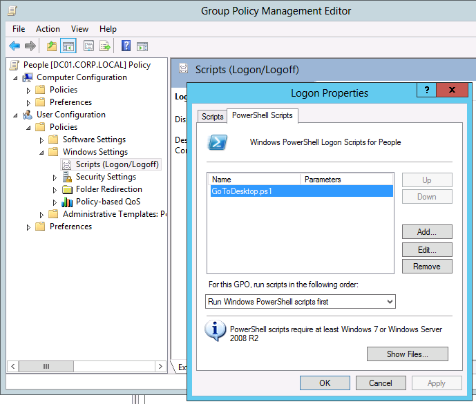 So long ago I blogged/ranted about how the Group Policy setting "Do not show the Start Menu when the user logs in" was explicitly disabled in Windows 8 (see The must NOT have Windows 8 Start Menu Group Policy Setting). But I have since found a way that you can actually implement this feature (all be it not perfectly) using a simple PowerShell start up script. This script in essence just types the work "Desktop + ENTER" when the user logs on to their session thus taking them to the desktop (see video below). Admittedly the user still load the Start Menu and the few seconds delay is a little annoying however it does technically boot to the desktop without any interaction with the user after they enter their logon credentials. If you want to setup this option then download the PowerShell script file below: Modify a policy that targets the users that you want to to apply. Navigate to User Configuration > Policies > Windows Settings > Scripts then double click on "Logon" and then select the "PowerShell Scripts" tab. Click the "Show Files..." button and copy the PowerShell script into the folder and then go back and click the "Add..." button and enter the name of the script e.g. GoToDesktop.ps1 . TIP: You may want to apply a WMI filter to this GPO to only apply to Windows 8