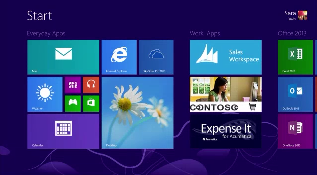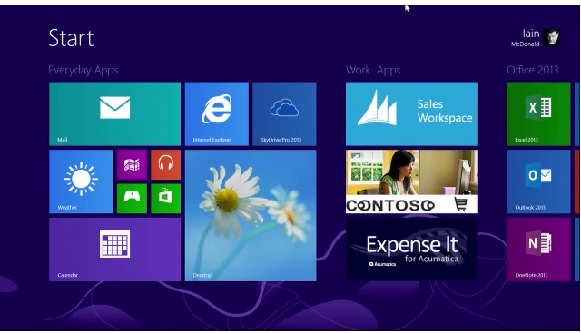 We start with the user "Sarah" below who has configured her start screen the way she wanted. IT Admins could configure this as a default out of the box configuration layout but after the users logs on they can change it anyway they want...