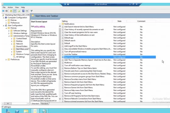 Step 3. Open the User Configuration > Policies > Administrative Templates > Start Menu and Taskbar and edit the "Start Screen Layout" policy setting.