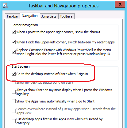 With the release of Windows Server 2012 R2 Preview many people are very pleased with the new option called "Go to the desktop instead of Start when I sign in" that allows then to boot direct the the desktop when the logon. If if follow this blog you know I have mentioned this "boot to desktop" option a few time here and here. So I quickly started for a Group Policy setting to see if this was also natively configurable via Group Policy... unfortunately... its not. But the good news is still very easy to configured via Group Policy by making a simple single registry key setting change.