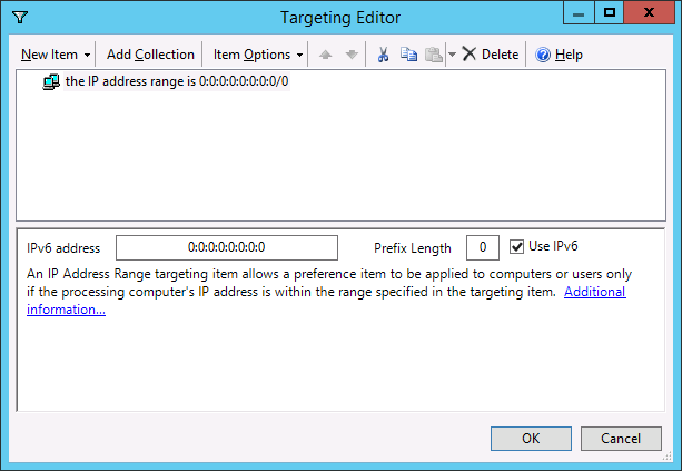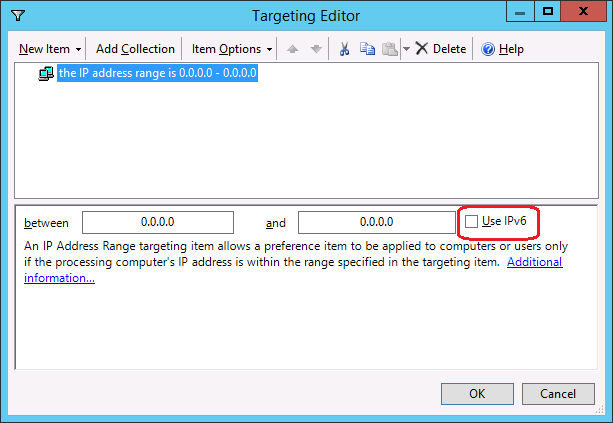 As your probably know the world facing an IP Apocalypse and as such sooner of later we will all have to start embracing IPv6 weather we like it or not. While Windows has supported IPv6 natively for many years now Microsoft has been slowly chipping away at IPv6 support for many of its other products. Well the good news is that Group Policy Preferences in Windows 8.1 / Server 2012 R2 now allows you to target Group Policy Preferences using IPv6 addresses.