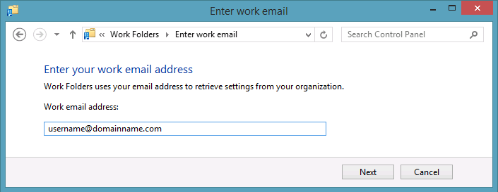 During the manual setup of the Work Folder they will be prompted for their work email address.