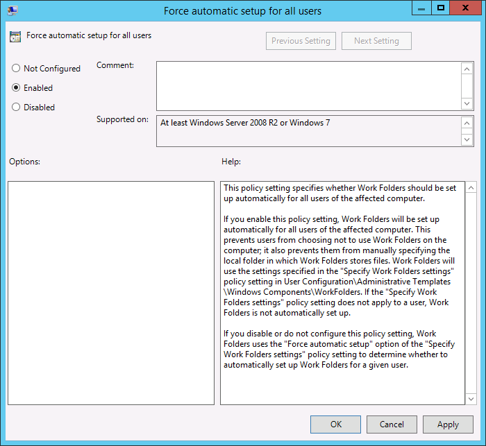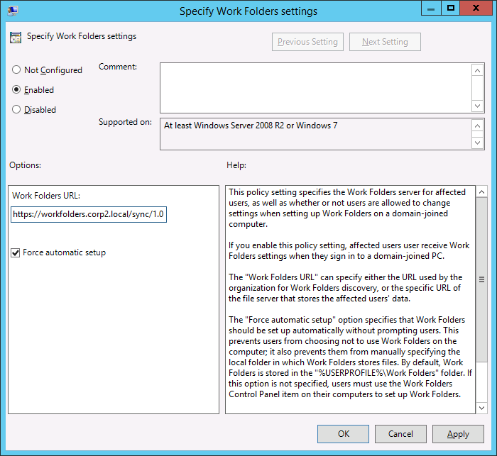 Tip: As all work folders user need to be in a security group you could filter this group policy object using the same security group to target just the users that are work folders enabled.