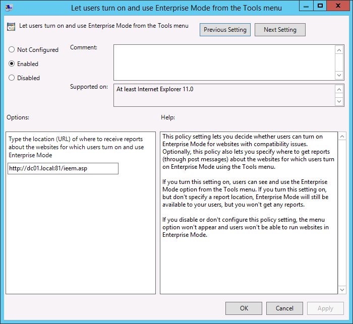 Optionally, this policy also lets you specify where to get reports about the websites for which users turn on Enterprise Mode using the Tools menu.