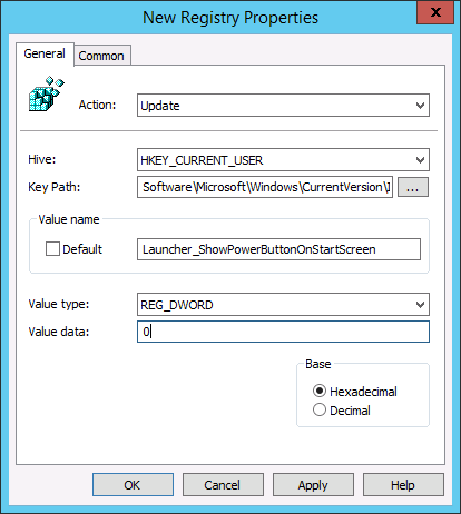 Then type in "Software\Microsoft\Windows\CurrentVersion\ImmersiveShell\Launcher\" into the Key Path field and "Launcher_ShowPowerButtonOnStartScreen" into the Value Name box. After that Select REG_DWORD and value "1" (enable) or "0" (disable) to configured the power button.