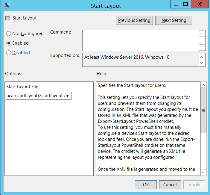 In release 1607 of Windows 10, Microsoft has now introduced a way to configured the Windows 10 taskbar using Group Policy. This feature allows Group Policy administrator to now add or replace the application that appear on the taskbar. This actually is the first time since Windows Vista that a Group Policy administrator has been able to configure the taskbar for a user. Before this you could only configure it by modifying the default users profile, but user would then be able to remove and reconfigured the taskbar however they wanted. To implement this feature you need to first create an XML file that has the required configuration information. This is actually just an addition to the same XML file you might already have deployed to configure your start menu. In fact the policy setting to apply the taskbar settings is the exact same "Start Layout" policy setting under "Users\Administrator Templates\Start Menu and Taskbar" that was introduced in Windows 8.1. image Once you have configured the XML then save it to a network share that has "Authenticated Users" read permission and then point the policy setting to use the XML file you saved at this location. Below is an example XML that will apply Paint, Microsoft Mail and Command Prompt to the taskbar.