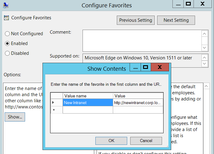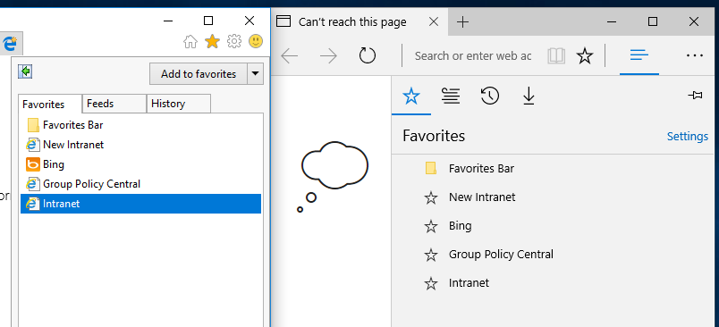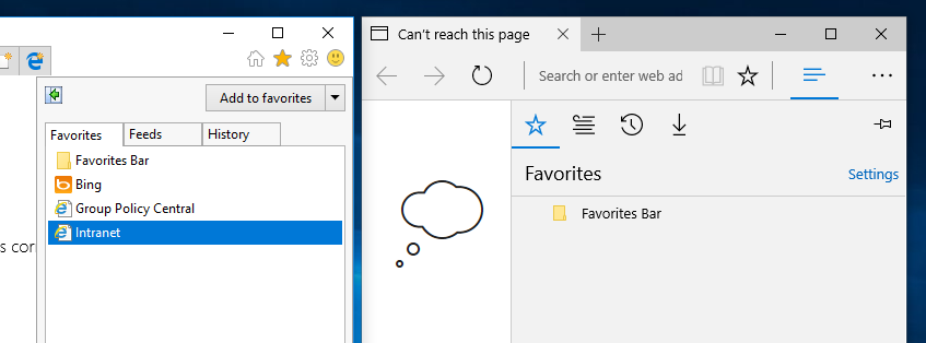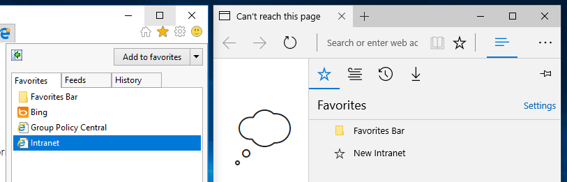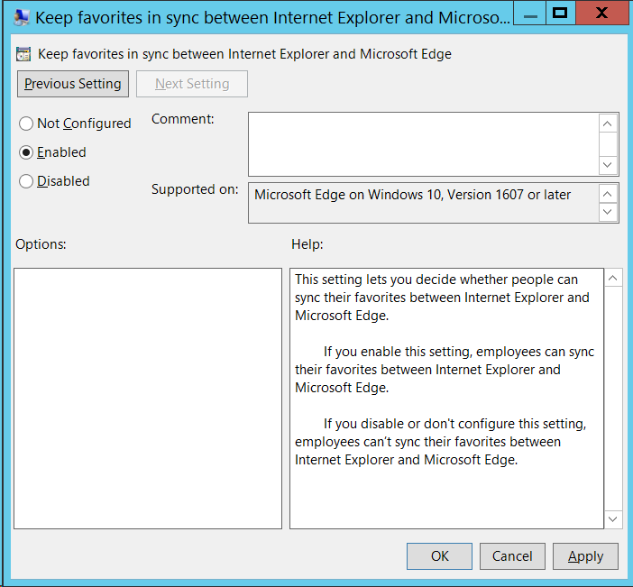 So to remove the need to duplicate Favourite configuration when starting to use Edge, the new policy setting enables the feature to sync favourites called "Keep favourites in sync between Internet Explorer and Microsoft Edge"
