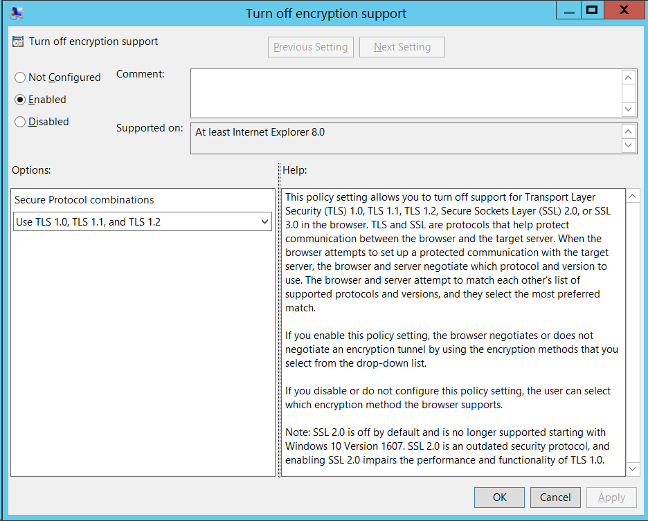 This article will show you how to disabled SSL v2 and SSL v3 on browsers on the client using Group Policy. SSL v2 and SSL v3 protocols for a long time has been considered to be broken protocols thanks to the many vulnerabilities found in these protocols like BEAST and POODLE to name but a few. While all newer browsers no longer have these protocols supports enabled by default you still might be But many web sites sill support these protocols due to legacy configuration. Therefore it's still a good idea to turn off these protocols on the web browsers so that clients are never forced into using these old and insecure protocols. It should be noted that while I say that this is a for browsers on the client these settings should be applied to all windows computers in your organisation whether they are servers or workstations. Now I would ALWAYS say that using a web browser on a server is a bad idea, in fact it should be blocked. However, just be realistic some admins can and do from time to time use browsers on servers meaning its still important to implement this lockdown on all your windows computers. Also, in case you were confused, SSL and TLS are pretty much the same thing. Just think of TLS 1.0 as SSL v4 and so on. Most people still think SSL when they see that padlock in the address bar, it just that mostly it is now secured using the TLS protocols. To disable SSL v2 and SSL v3 its best to create a Computer based Group Policy settings that applies at the top level of your domain. In GPMC navigate to Computers Configuration > Policies > Administrative Templates > Windows Components > Internet Explore > Internet Control Panel > Advanced Page and then open the policy setting called "Turn off encryption support". Once you have the policy open you will notice there is a drop down option that will give you 32 different permutation of having enabled or disabling SSL and TLS. Generally most sites on the Internet with encryption support TLS 1.0 or later. So the best bet would be to select the option "Use TLS 1.0, TLS 1.1, and TLS 1.2".